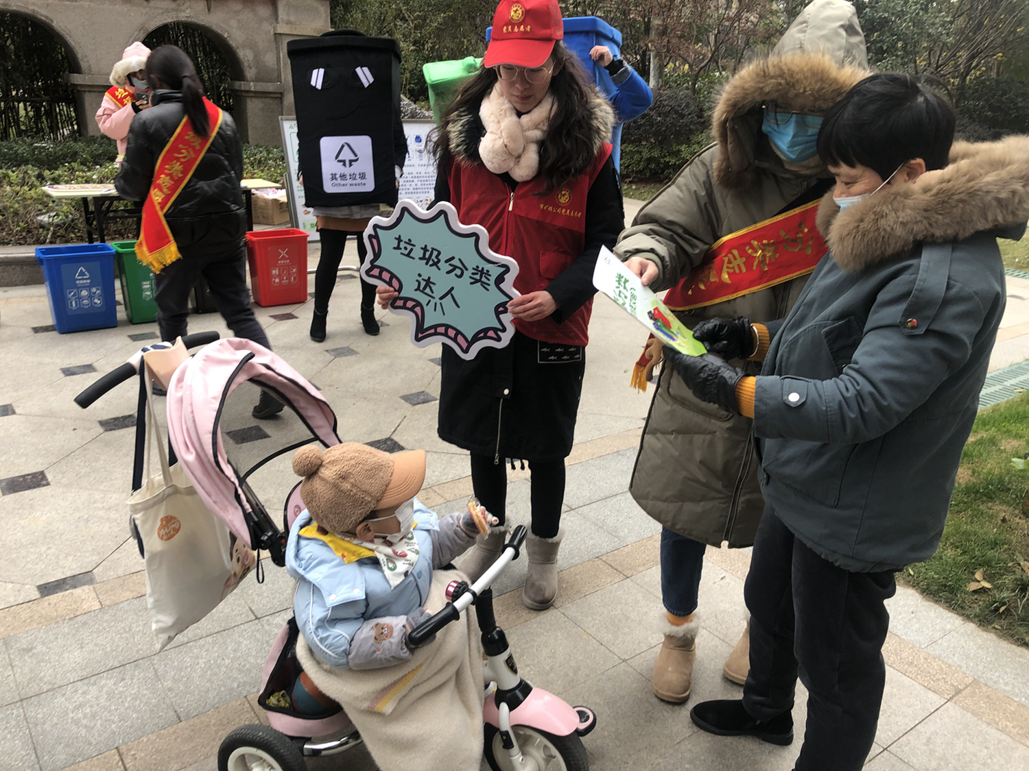 活動中,志愿者們身穿“可回收物”、“廚余垃圾”、“有害垃圾”、“其他垃圾”四色玩偶服,通過向居民發(fā)放宣傳單頁、開展“垃圾分分樂”、“垃圾分類跳棋”游戲等方式,向其宣傳垃圾分類相關知識?;顒蝇F(xiàn)場氣氛火熱,社區(qū)居民不畏嚴寒,紛紛從家中拿出廢舊電池、舊水銀溫度計等有害垃圾換取垃圾袋。