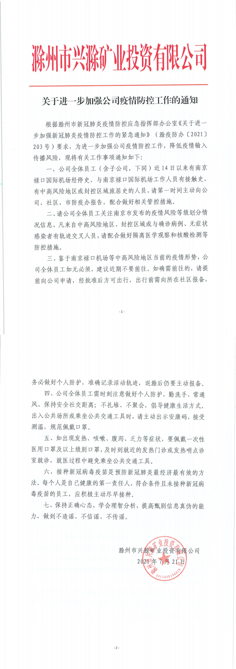 關(guān)于進(jìn)一步加強(qiáng)公司疫情防控工作的通知