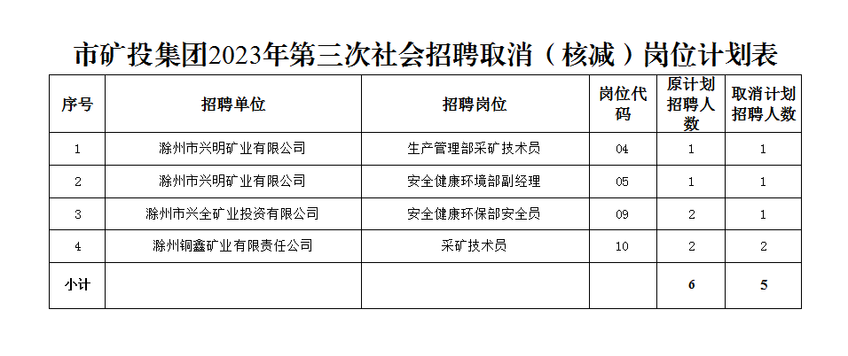 根據(jù)《滁州市興滁礦業(yè)投資集團有限公司2023年第三次社會招聘公告》規(guī)定,經(jīng)對各崗位報名情況篩查審定,結(jié)合資格復(fù)審情況,部分崗位報名情況未達到開考比例,經(jīng)研究決定取消(核減)以下崗位招聘計劃: