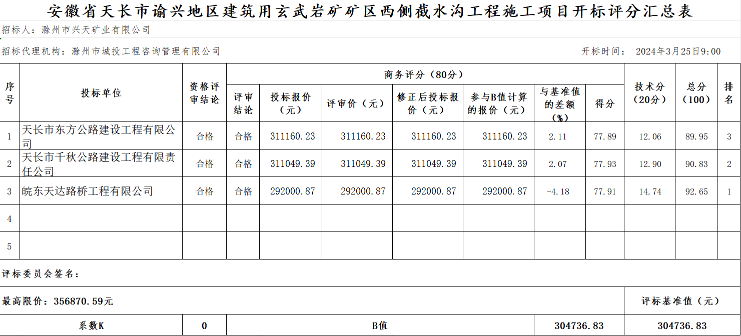 | 第三中標(biāo)候選人 | 投標(biāo)人名稱 | 天長市東方公路建設(shè)工程有限公司 | |